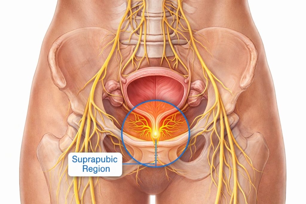 تقع هذه المنطقة في ما يُعرف بـ المنطقة فوق العانة Suprapubic Region، وهي غنية بالنهايات العصبية الحسية والذاتية المرتبطة بالجهاز العصبي المستقل، وتشمل: