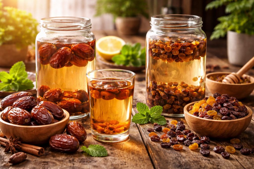 يُنقع التمر أو الزبيب في ماء نظيف مدة 8–12 ساعة.